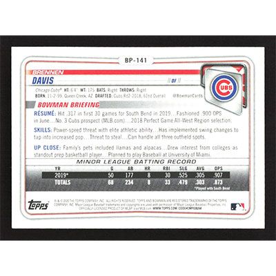 This is a 2020 Bowman Prospects Brennen Davis baseball card. The card is #BP-141 and pictures show condition.