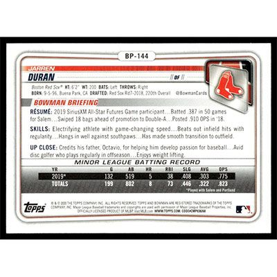 This is a 2020 Bowman Prospects Jarren Duran baseball card. The card is #BP-144 and pictures show condition.