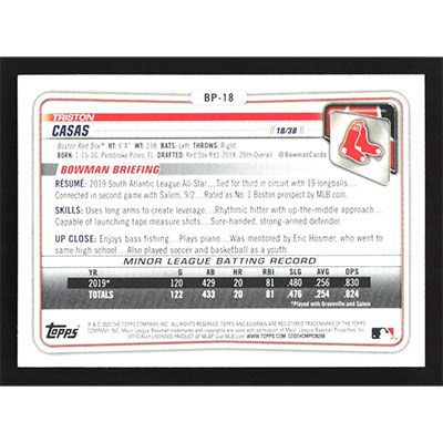 This is a 2020 Bowman Prospects Triston Casas baseball card. The card is #BP-18 and pictures show condition.