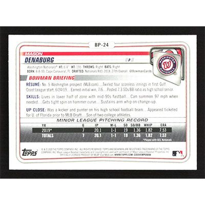 This is a 2020 Bowman Prospects Mason Denaburg baseball card. The card is #BP-24 and pictures show condition.