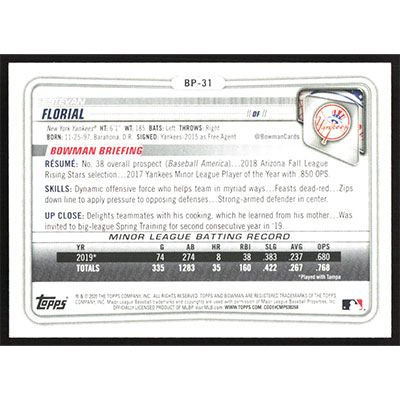 This is a 2020 Bowman Prospects Estevan Florial baseball card. The card is #BP-31 and pictures show condition.