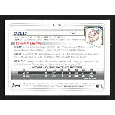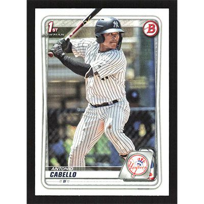This is a 2020 Bowman Prospects Antonio Cabello baseball card. The card is #BP-85 and pictures show condition.