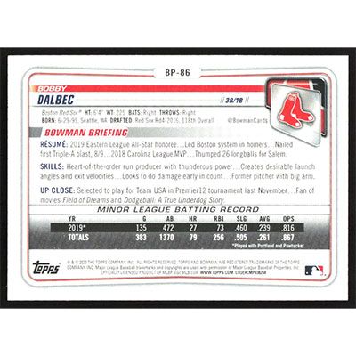 This is a 2020 Bowman Prospects Bobby Dalbec baseball card. The card is #BP-86 and pictures show condition.