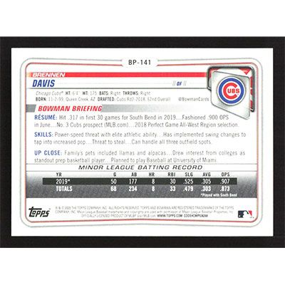 This is a 2020 Bowman Prospects Camo Brennen Davis baseball card. The card is #BP-141 and pictures show condition.