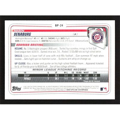 This is a 2020 Bowman Prospects Camo Mason Denaburg baseball card. The card is #BP-24 and pictures show condition.