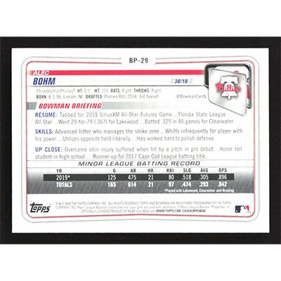 This is a 2020 Bowman Prospects Camo Alec Bohm baseball card. The card is #BP-29 and pictures show condition.