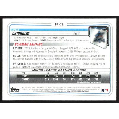 This is a 2020 Bowman Prospects Camo Jazz Chisholm baseball card. The card is #BP-72 and pictures show condition.