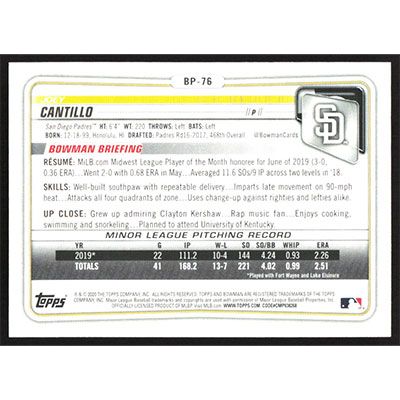 This is a 2020 Bowman Prospects Camo Joey Cantillo baseball card. The card is #BP-76 and pictures show condition.