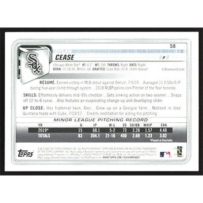 This is a 2020 Bowman Purple Dylan Cease Roller Mark baseball card. The card is #58 and pictures show condition. This card is limited; #'d 051/250. Team(s): Chicago White Sox Rookie Card (RC)