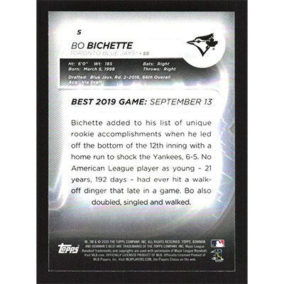 This is a 2020 Bowman's Best Bo Bichette baseball card. The card is #5 and pictures show condition.