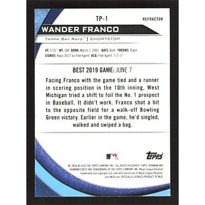 This is a 2020 Bowman's Best Top Prospects Refractors Wander Franco baseball card. The card is #TP-1 and pictures show condition.
