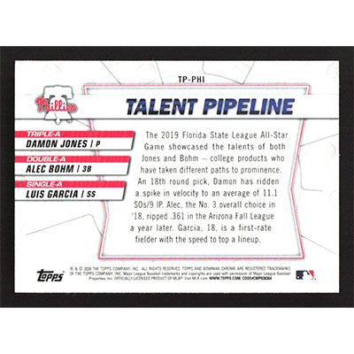 This is a 2020 Bowman Talent Pipeline Luis Garcia, Damon Jones and Alec Bohm baseball card. The card is #TP-PHI and pictures show condition. Team(s): Philadelphia Phillies