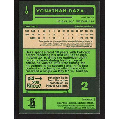 This is a 2020 Classics Yonathan Daza baseball card. The card is #10 and pictures show condition.