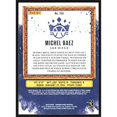 This is a 2020 Diamond Kings Michel Baez short print baseball card. The card is #154 and pictures show condition. Team(s): San Diego Padres Rookie Card (RC)