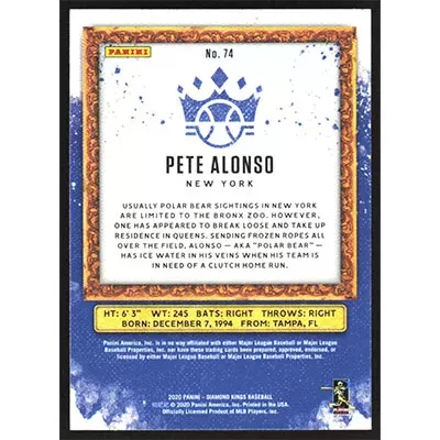 This is a 2020 Diamond Kings Pete Alonso baseball card. The card is #74 and pictures show condition.