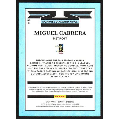 This is a 2020 Donruss Miguel Cabrera Diamond King baseball card. The card is #11 and pictures show condition.