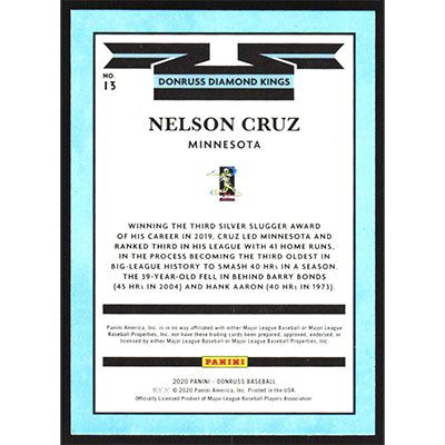 This is a 2020 Donruss Nelson Cruz Diamond Kings baseball card. The card is #13 and pictures show condition.