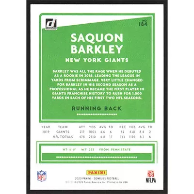 This is a 2020 Donruss Saquon Barkley football card. The card is #184 and pictures show condition.