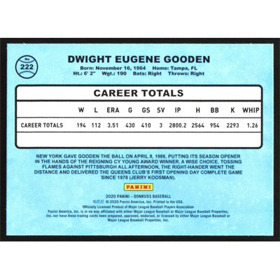 This is a 2020 Donruss Dwight Gooden Retro baseball card. The card is #222 and pictures show condition.