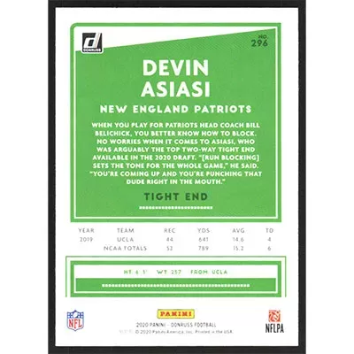 This is a 2020 Donruss Devin Asiasi football card. The card is #296 and pictures show condition.