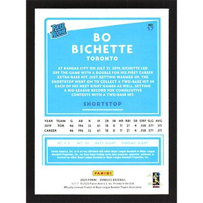 This is a 2020 Donruss Bo Bichette Rated Rookie baseball card. The card is #37 and pictures show condition. Team(s): Toronto Blue Jays Rookie Card (RC)