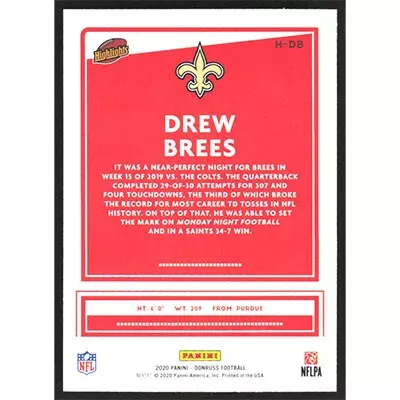 This is a 2020 Donruss Highlights Drew Brees football card. The card is #H-DB and pictures show condition.