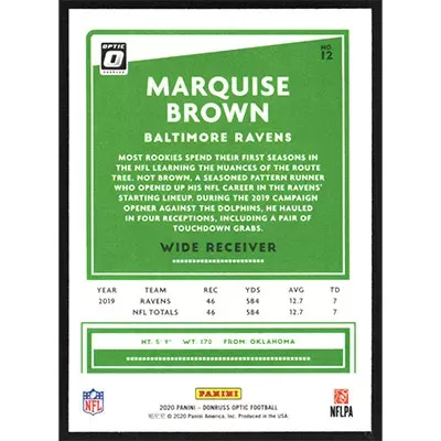 This is a 2020 Donruss Optic Marquise Brown football card. The card is #12 and pictures show condition.
