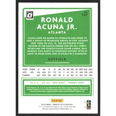 This is a 2020 Donruss Optic Ronald Acuña Jr. baseball card. The card is #169 and pictures show condition.