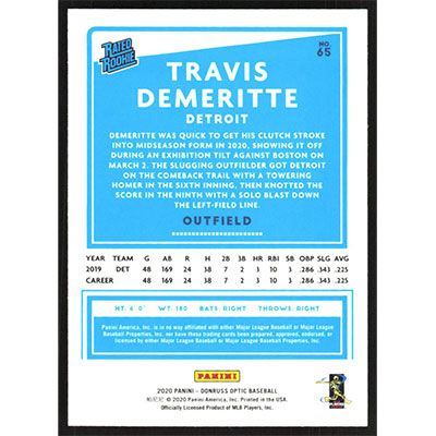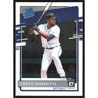 This is a 2020 Donruss Optic Travis Demeritte Rated Rookie baseball card. The card is #65 and pictures show condition. Team(s): Detroit Tigers Rookie Card (RC)