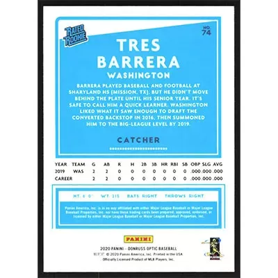 This is a 2020 Donruss Optic Tres Barrera Rated Rookie baseball card. The card is #74 and pictures show condition. Team(s): Washington Nationals Rookie Card (RC)