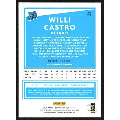 This is a 2020 Donruss Optic Willi Castro Rated Rookie baseball card. The card is #92 and pictures show condition. Team(s): Detroit Tigers Rookie Card (RC)