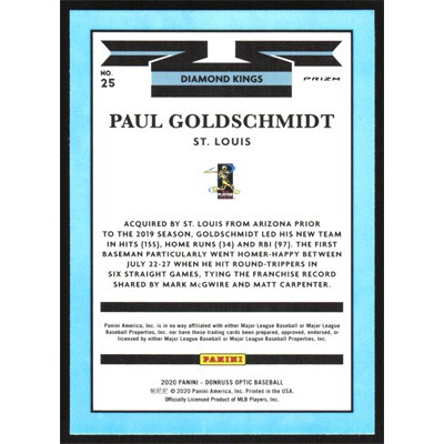This is a 2020 Donruss Optic Holo Paul Goldschmidt Diamond Kings baseball card. The card is #25 and pictures show condition. Team(s): St. Louis Cardinals