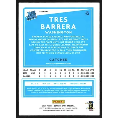 This is a 2020 Donruss Optic Pink Tres Barrera Rated Rookie baseball card. The card is #74 and pictures show condition. Team(s): Washington Nationals Rookie Card (RC)