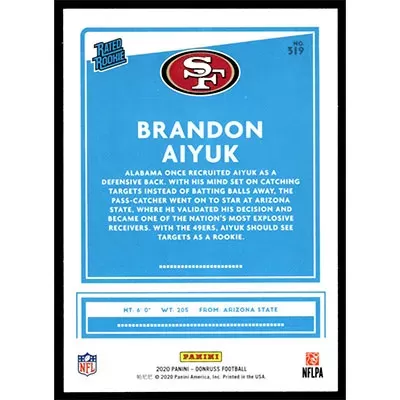 This is a 2020 Donruss Press Proof Red Brandon Aiyuk Rated Rookie football card. The card is #319 and pictures show condition. Team: San Francisco 49ers Rookie Card