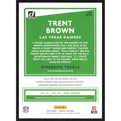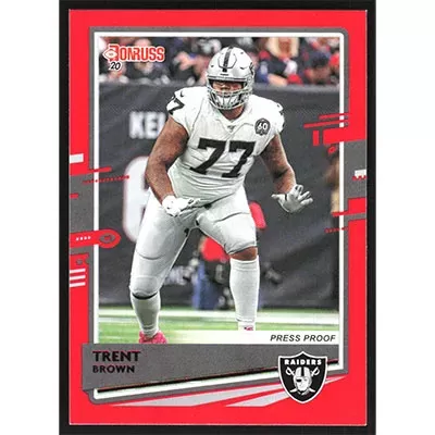 This is a 2020 Donruss Press Proofs Red Trent Brown football card. The card is #202 and pictures show condition.