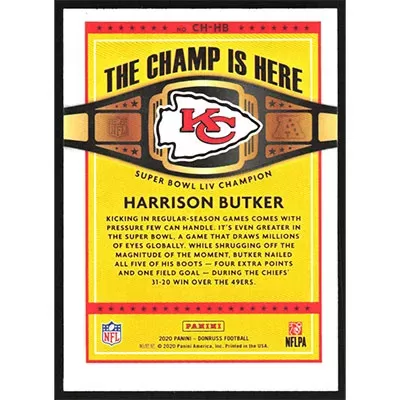 This is a 2020 Donruss The Champ is Here Harrison Butker football card. The card is #CH-HB and pictures show condition.