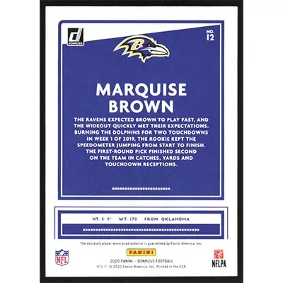 This is a 2020 Donruss Threads Blue Marquise Brown Jersey football card. The card is #12 and pictures show condition.