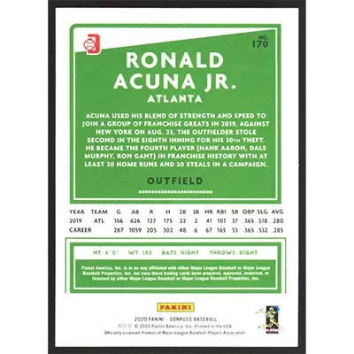 This is a 2020 Donruss Variatons Ronald Acuña Jr. Nickname baseball card. The card is #170 and pictures show condition.