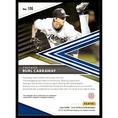 This is a 2020 Elite Extra Edition Pink Burl Carraway baseball card. The card is #106 and pictures show condition.