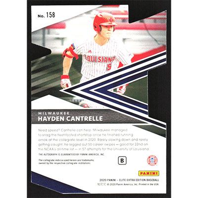 This is a 2020 Elite Extra Edition Signatures Prime Numbers Die Cut Hayden Cantrelle autographed baseball card. This card has been signed, in blue, by Hayden Cantrelle, and is certified authentic by Panini. The card is #158 and pictures show condition. This card is limited; #'d 02/49.