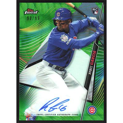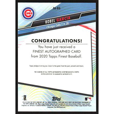 This is a 2020 Finest Autographs Green Wave Refractors Robel Garcia autographed baseball card. This card has been signed, in blue, by Robel Garcia, and is certified authentic by Topps. The card is #FA-RG and pictures show condition. This card is limited; #'d 98/99.
