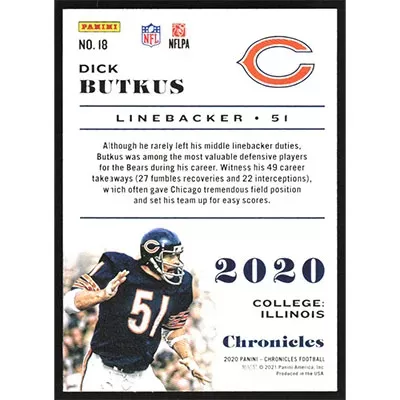 This is a 2020 Panini Chronicles Dick Butkus football card. The card is #18 and pictures show condition.