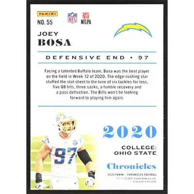 This is a 2020 Panini Chronicles Joey Bosa football card. The card is #55 and pictures show condition.