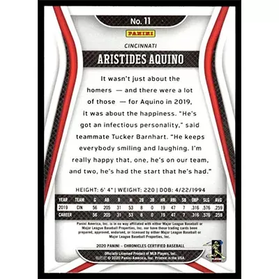 This is a 2020 Panini Chronicles Certified Aristides Aquino baseball card. The card is #11 and pictures show condition. Team(s): Cincinnati Reds Rookie Card (RC)