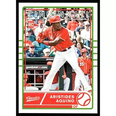 This is a 2020 Panini Chronicles Classics Aristides Aquino baseball card. The card is #3 and pictures show condition. Team(s): Cincinnati Reds Rookie Card (RC)