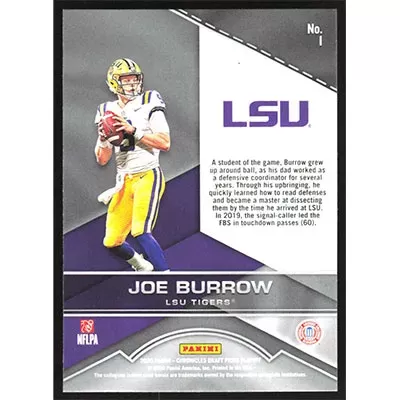 This is a 2020 Panini Chronicles Draft Picks Playoff Joe Burrow football card. The card is #1 and pictures show condition. Team(s): LSU Tigers Rookie Card (RC)