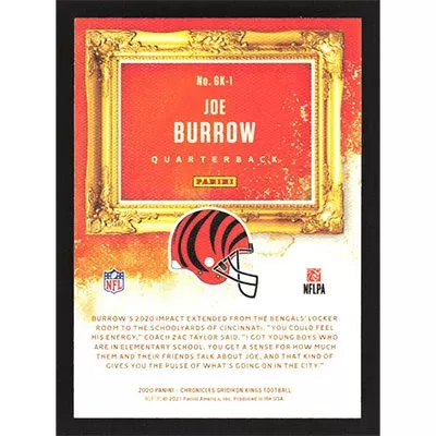 This is a 2020 Panini Chronicles Gridiron Kings Joe Burrow football card. The card is #GK-1 and pictures show condition. Team(s): Cincinnati Bengals Rookie Card (RC)