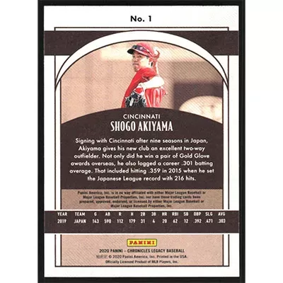 This is a 2020 Panini Chronicles Legacy Shogo Akiyama baseball card. The card is #1 and pictures show condition. Team(s): Cincinnati Reds Rookie Card (RC)