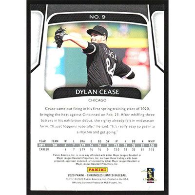 This is a 2020 Panini Chronicles Limited Dylan Cease baseball card. The card is #9 and pictures show condition. Team(s): Chicago White Sox Rookie Card (RC)