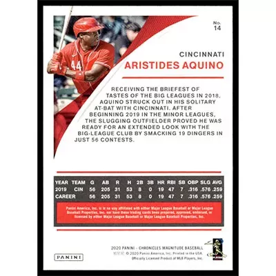 This is a 2020 Panini Chronicles Magnitude Aristides Aquino baseball card. The card is #14 and pictures show condition. Team(s): Cincinnati Reds Rookie Card (RC)